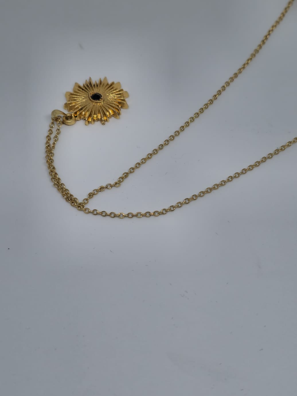 Dişil’in mistik ruhunu yansıtan bu güneş kolye, merkezindeki koyu renkli göz detayıyla hem karakteristik bir tarz hem de koruyucu bir enerji sunuyor. Güneşin ışınlarını andıran dökümlü gold tasarımı, bohem ve modern stili bir araya getiriyor. Fark yaratmayı seven kadınlar için tasarlanan bu parça, kombinlerinizin odak noktası olacak. Stilinize mistik bir dokunuş katmak için bu özel tasarımı kaçırmayın.